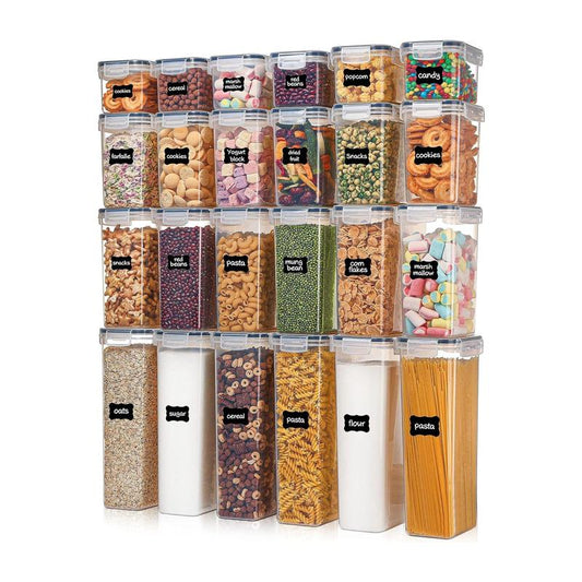 Vtopmart Airtight Food Storage Containers with Lids, 24 / 32 Pcs Plastic Kitchen and Pantry Organization Canisters for Cereal, Dry Food, Flour and Sugar, BPA Free, Includes 24/32 Labels Silicone Utensils