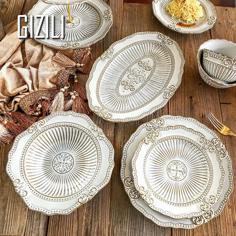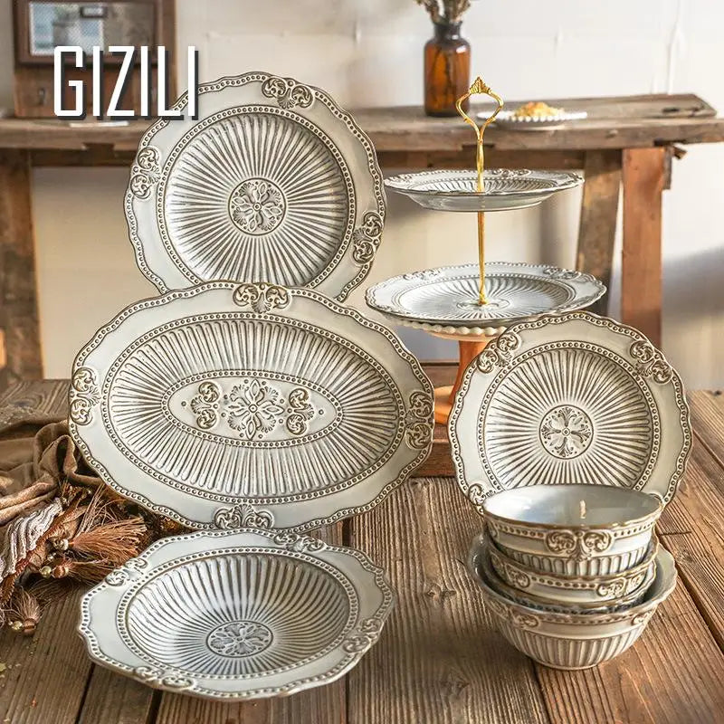 French Dinner Plates Set Luxury Tableware Bowl Set Household Retro Ceramic Dinnerware Bowl Plate Bowl Set Kitchen Supplies