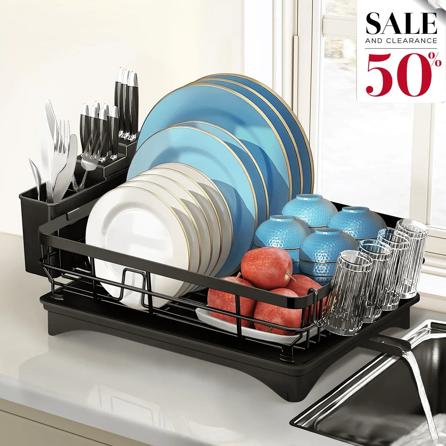Stainless Steel Dish Drying Rack, Rustproof Dish Drainer with Utensil Holder for Kitchen, Suitable for Undermount Sinks, Black, Size 11.8"D x 16.7"W x 5.7"H